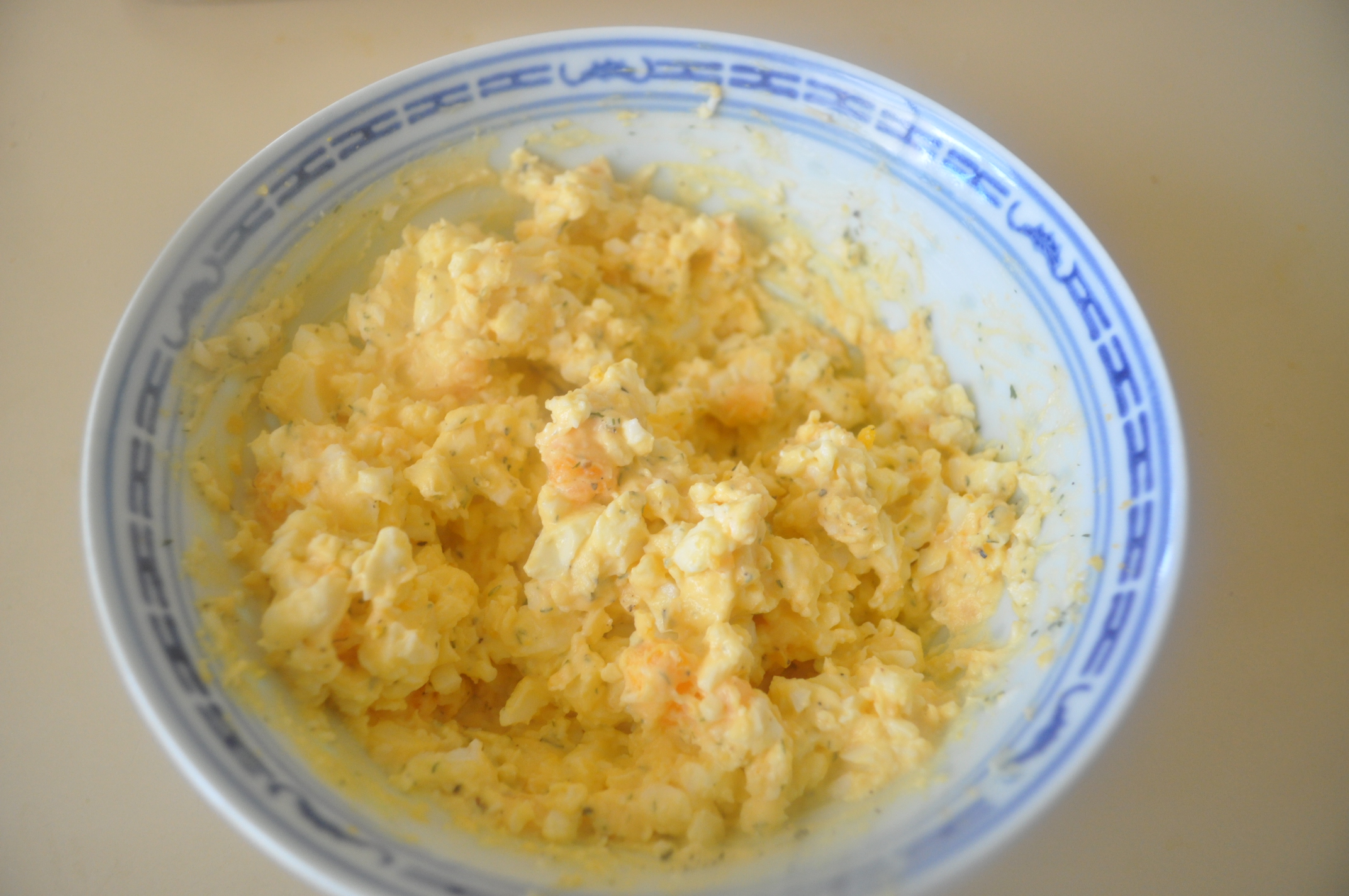 6 eggs, hard-boiled 1?4 cup reduced-fat mayonnaise 1 teaspoon fresh dill, chopped (I use more) salt and pepper