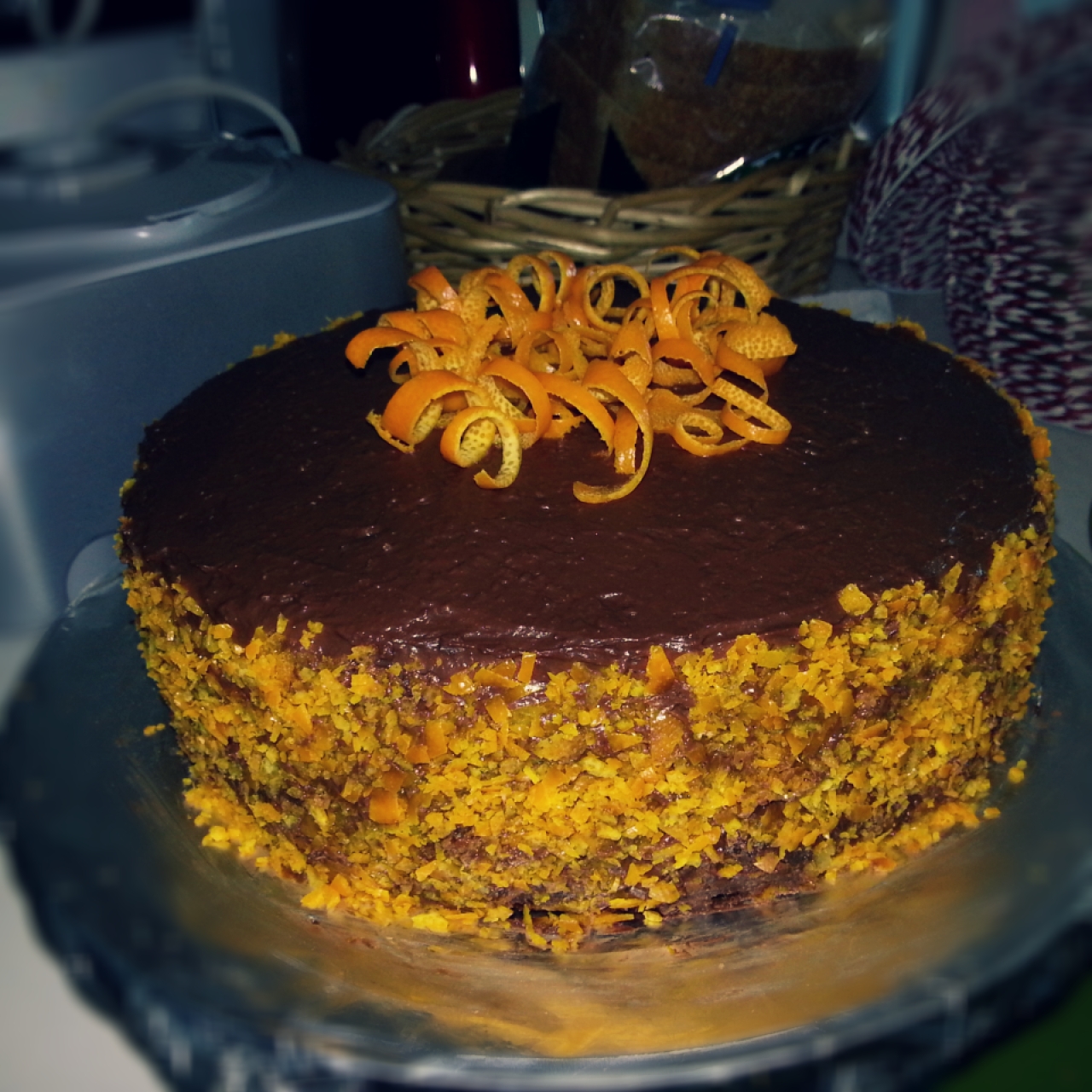 2 small thin-skinned oranges, approx. 375g total weight (or 1 large) 6 eggs 1 teaspoon baking powder 1?2 teaspoon bicarbonate of soda 200 g ground almonds 250 g caster sugar 50 g cocoa orange peel, for decoration
