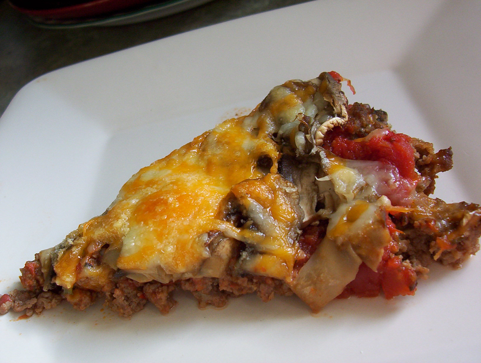 1 lb lean ground beef 2 cups shredded part-skim mozzarella cheese, divided 1?2 cup low-sugar pizza sauce (I use Ragu) diced Canadian bacon low-fat pepperoni turkey pepperoni (optional) onion green pepper mushroom tomatoes (optional) your favorite pizza seasoning, to taste