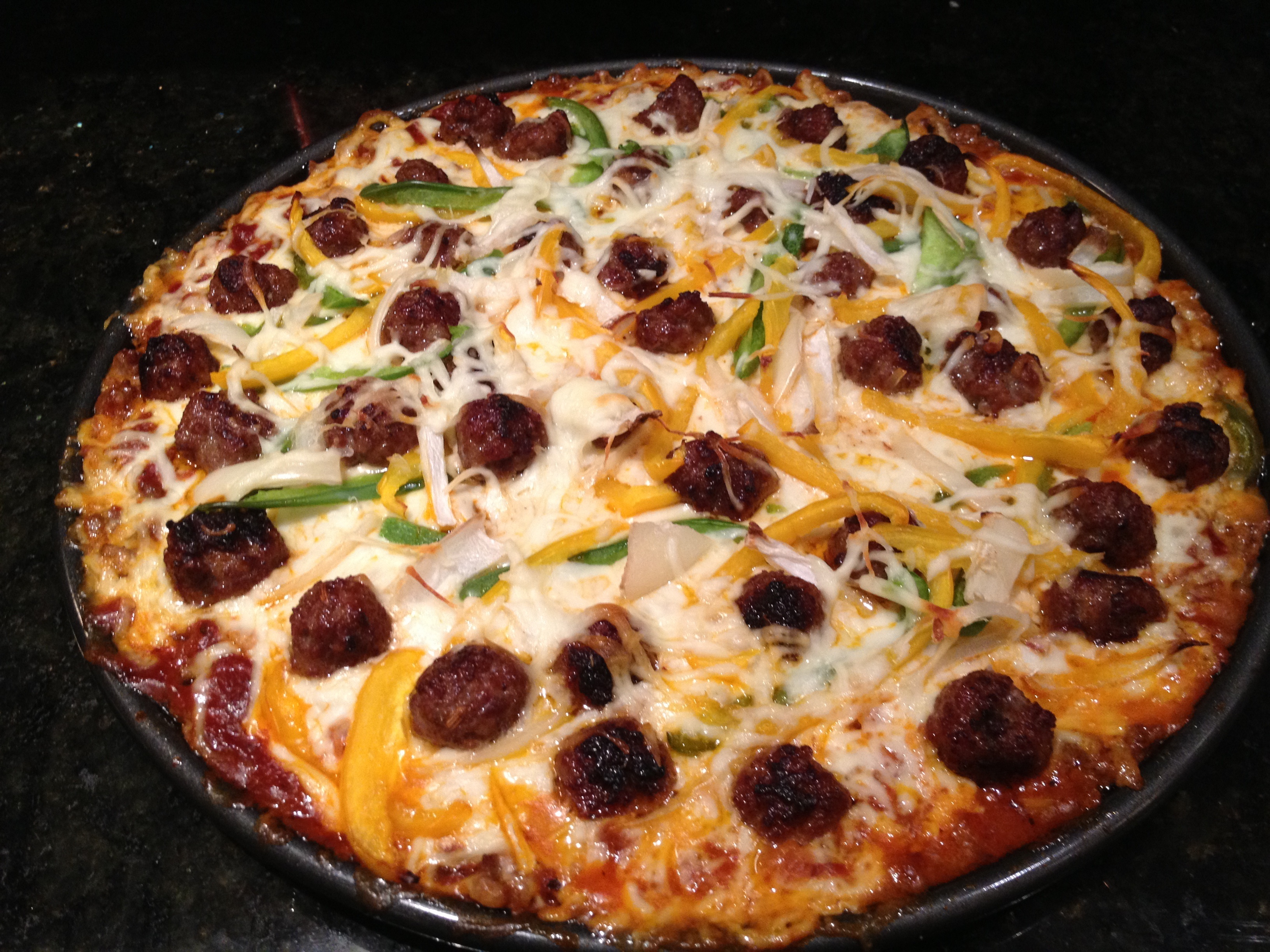 Preheat oven to 350 degrees. Meanwhile, brown the ground beef; drain. Place meat in a mixing bowl and mix with 1 cup of mozzarella. Spread the mixture into a circle on a round pizza pan or baking stone (I prefer the stone); and top with 1/2 cup pizza sauce. Top with the rest of the mozzarella, optional toppings and seasonings. Bake for about 25 minutes or until cheese is melted and browned.