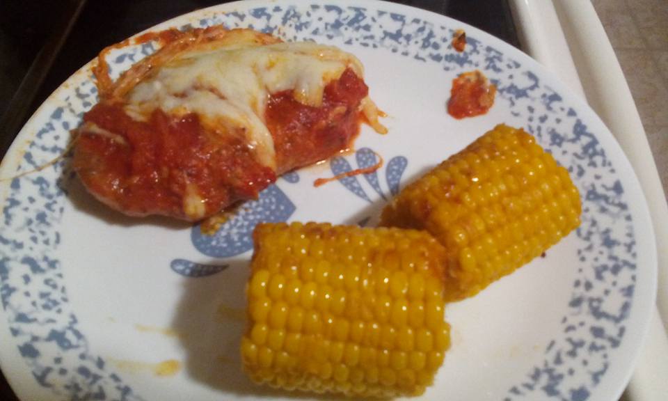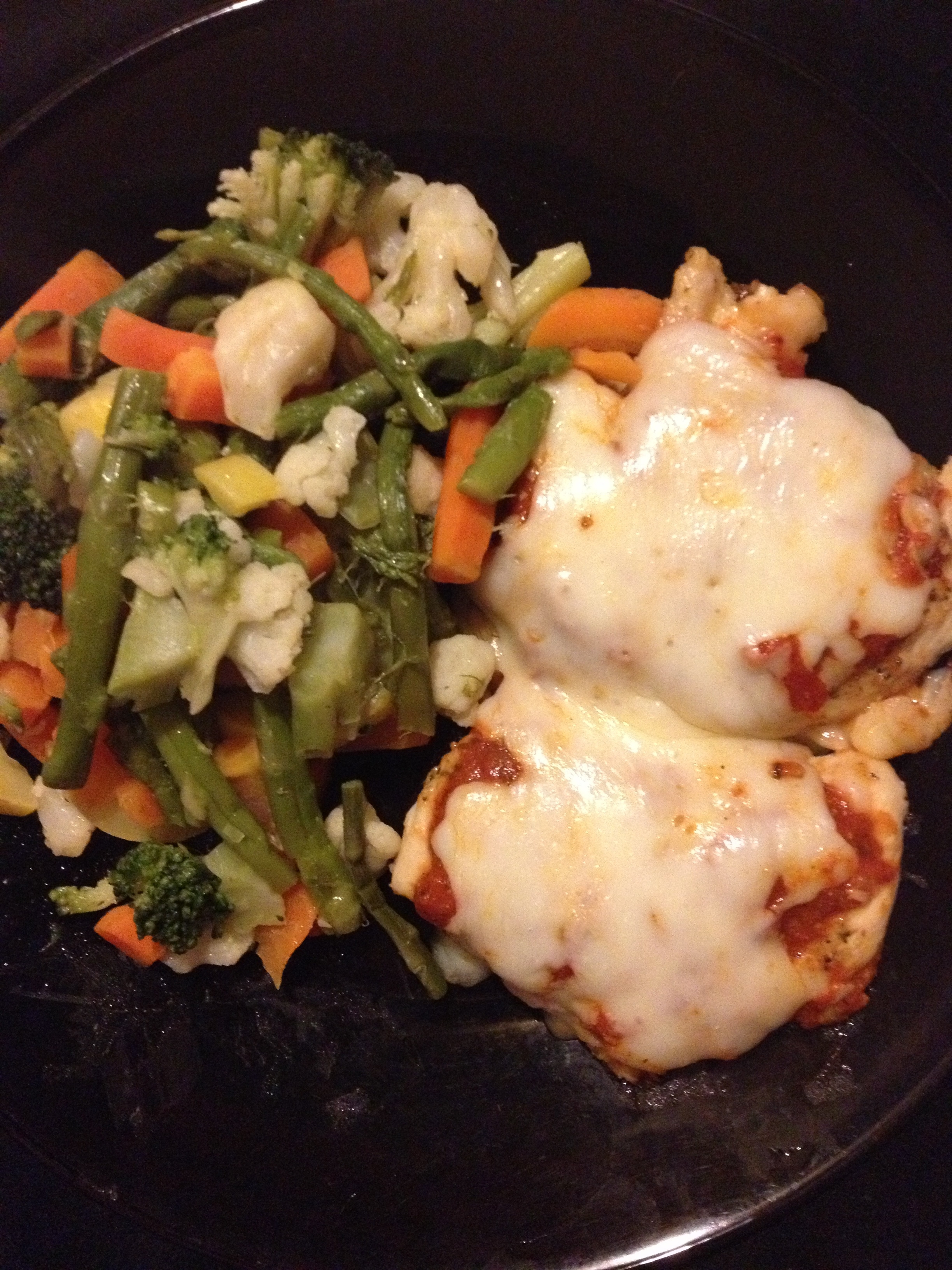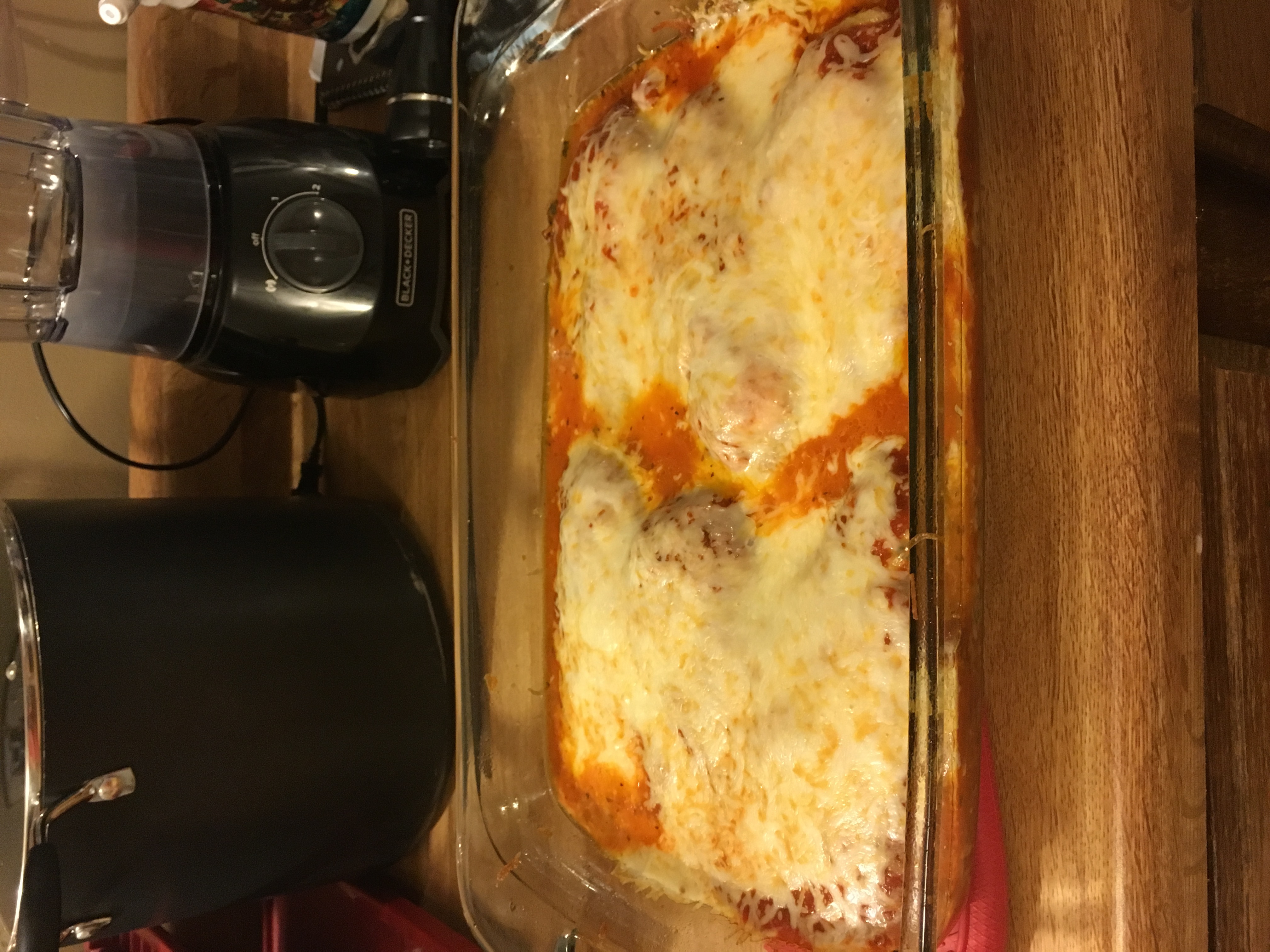 Preheat oven to 400. Combine parmesan cheese, parsley, basil and oregano in a baggie. Wash each breast with water and put in cheese mixture. Spray 11 x 13 pan wih olive oil cooking spray. Make sure each piece is coated with cheese and place each breast in pan and dump remaining cheese mixture on top. Cook for 20-25 minutes until chicken is done. Top with spaghetti sauce and then add mozzarella cheese. Bake unitl cheese is melted, about 5 minutes. Serve with a side of spaghetti, salad and garlic bread.