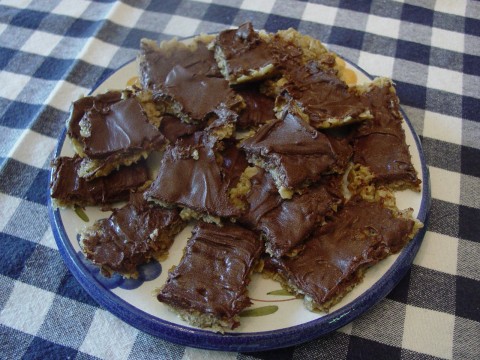 Combine oats and butter in 2-quart glass Mix-N-Pour bowl. Microwave on High, uncovered, 3 to 4 minutes, or until heated through. Stir in brown sugar and corn syrup. Microwave on High, uncovered, 1 1/2 to 2 1/2 minutes or until heated and sugar is dissolved. Turn into greased 10 x 6-inch baking dish. Press evenly in dish. Place chocolate pieces in 1 cup glass measure. Microwave, on High, for 1 1/2 to 2 1/2 minutes or until chocolate is glossy, stirring once. Stir until smooth. Blend in peanut butter, spread over bars. Refrigerate until chocolate is set. Cut into squares. Makes 24 bars.