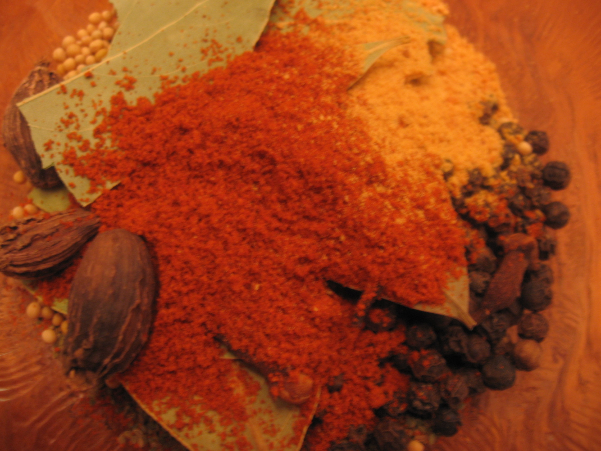 1 tablespoon celery seed 1 tablespoon whole black peppercorn 6 bay leaves 1?2 teaspoon whole cardamom pod 1?2 teaspoon mustard seeds 4 whole cloves 1 teaspoon sweet Hungarian paprika 1?4 teaspoon mace